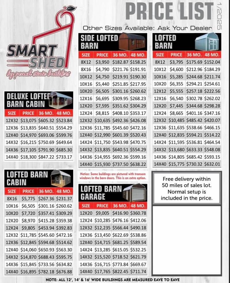 Inquire today to see about our 10% OFF Discount! Here is our current pricing sheets for all sizes, styles, and models. If you are wanting to customize, prices can be subject to change.